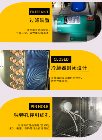 6.觀測視窗: 三層真空玻璃,便于觀察試品使用。尺寸:220x280x40mm;